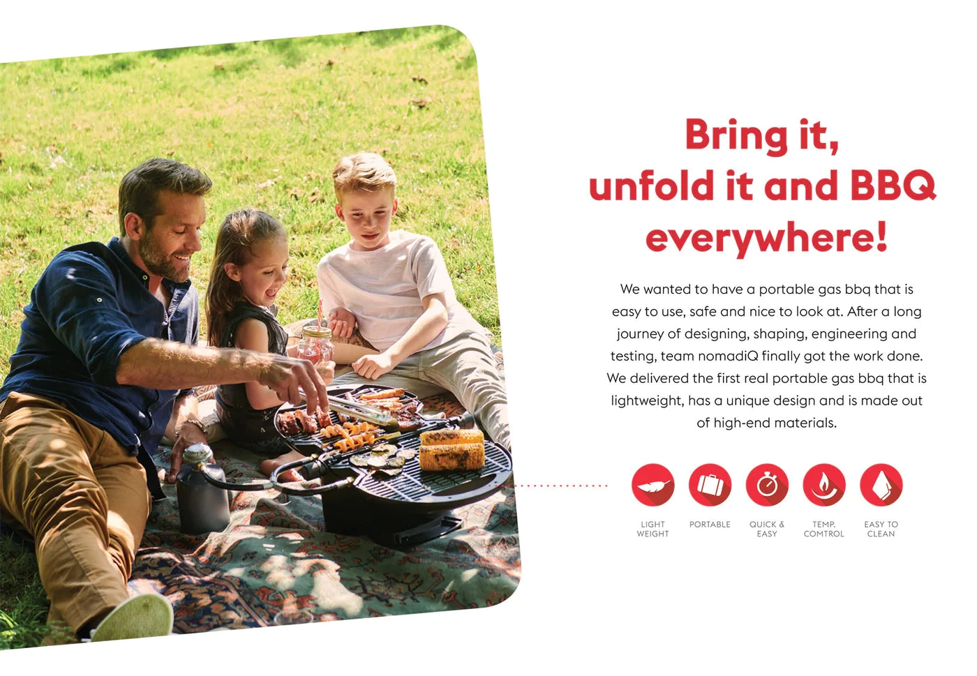 The nomadiQ is an innovative portable BBQ that offers versatility and convenience. Its unique foldable design provides two separate cooking surfaces, with independent temperature control on each side so you can grill and cook simultaneously. Forget about multiple utensils and appliances – the nomadiQ provides you with one efficient and easy-to-use solution for all your outdoor cooking needs.