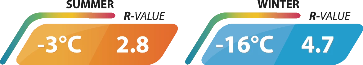 - R-Value 2.8 (-3 degrees C) / 4.7 (-16 degrees C)