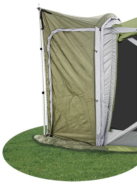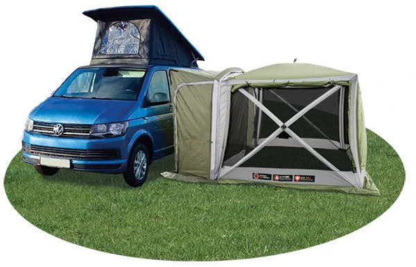 Built to fit the Screen House 4 and 6 Pro the vehicle connector is designed to connect your screen house to a vehicle. It connects to vehicles between 180 and 210cm and simply zips onto the existing accessory zip and instantly gives you tunnel connector with two doors on.